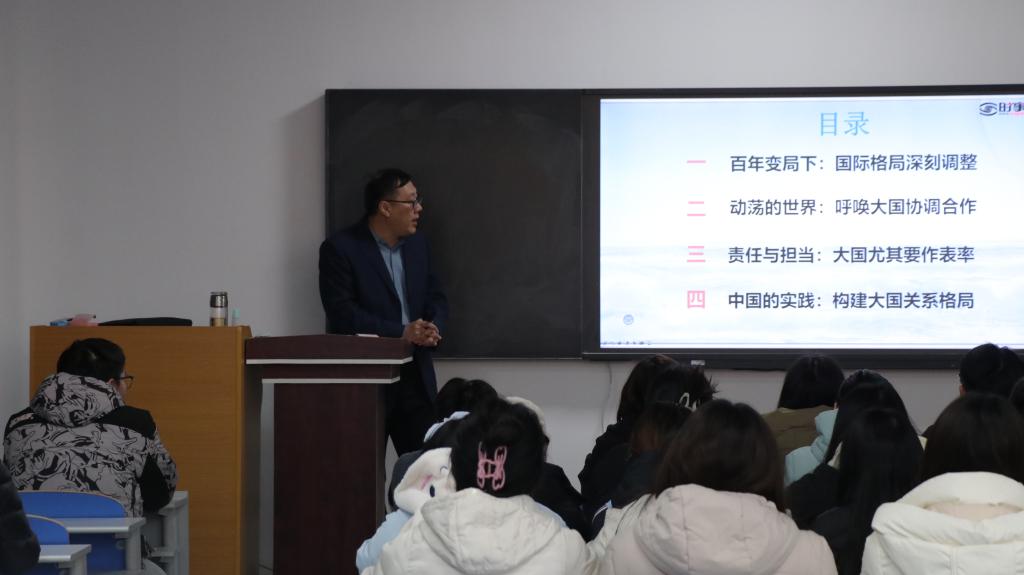 2024年12月2日下午,伟德betvlctor体育官网副校长师鹏莅临伟德betvlctor体育官网,给部分老师、学生进行主题为《推动构建新时代大国关系》党课教育活动,师鹏首先就目前所处的时代进行总体描述,然后深入浅出的与大学生的学习、生活紧密联系起来。自古以来,大国之间的关系就是世界政治的重要组成部分。大国关系的演变始终影响着国际秩序的稳定与变迁。进入21世纪,随着多极化趋势的加速发展,各国之间的相互依存和合作需求更加紧密。新时代大国关系的特征面对新的国际形势和挑战,新时代的大国关系具有几个显著特征。首先,强调平等相待,尊重彼此的核心利益和重大关切。其次,倡导合作共赢,寻求共同发展和繁荣。再者,也强调处理分歧的重要性,通过对话和协商解决矛盾,避免对抗和冲突。