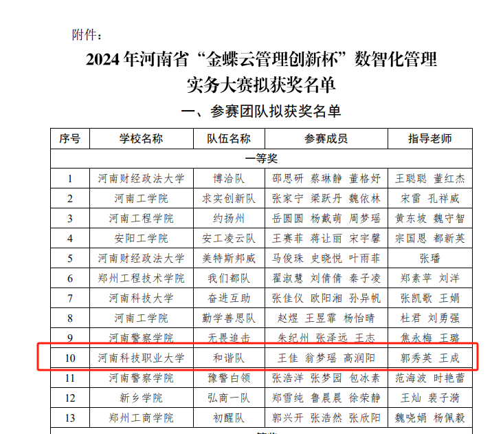 近日,根据河南省高等教育学会《关于举办 2024 年河南省“金蝶云管理创新杯”数智化管理实务大赛的通知》(豫高教学会〔2024〕23号)安排,2024年11月16日和23日举办了2024年河南省“金蝶云管理创新杯”数智化管理实务大赛。省内有45所本科院校129支队伍参加竞赛。经过角逐,产生一等奖13项,二等奖31项,三等奖34项。其中,伟德betvlctor体育官网获得一等奖1项,指导教师郭秀英、王成,二等奖一项,指导教师刘星星、徐贺,三等奖一项,指导教师王雪芳、闫海恒。