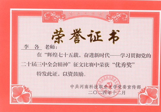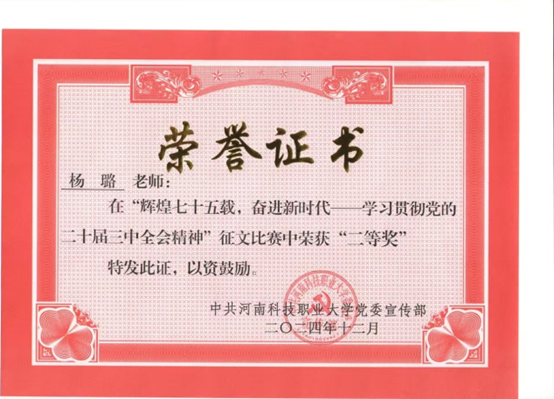 近日,由中共伟德betvlctor体育官网党委宣传部主办的“辉煌七十五载,奋进新时代——学习贯彻党的二十届三中全会精神”征文比赛结果公布,我院杨璐、李培园老师的作品凭借深刻的理论思考、鲜活的内容表达,在众多参赛作品中脱颖而出,荣获二等奖,李各老师获得优秀奖。